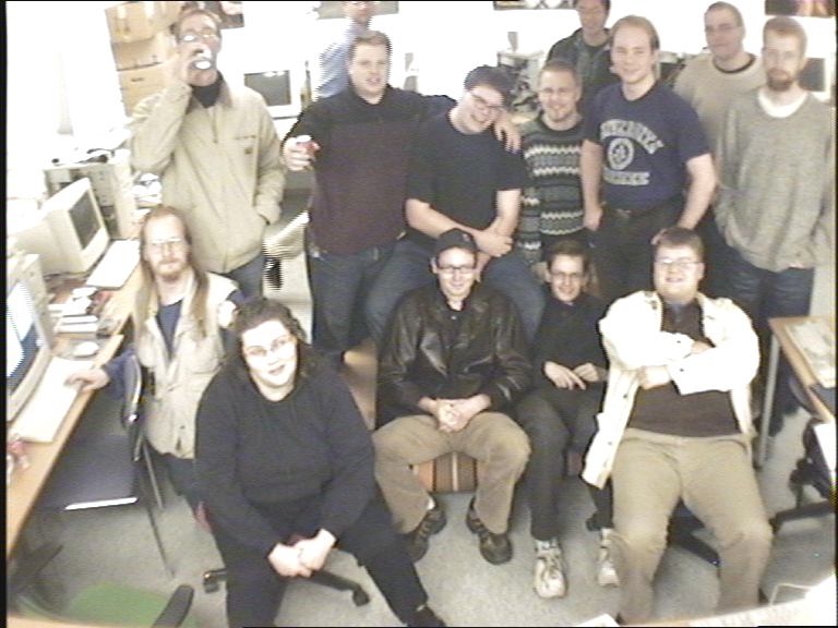 Bakre raden, från vänster: Douglas Nilsson, Tomas Fredriksson (Johan Bryssling gömmer sig bakom honom), Leif Andersson, Roy ”Mooie” Sandgren, Ka‐Chun Cheung i bakgrunden, Thomas Sundblom, Christian ”Croister” Lindblom och Filip Wessman.